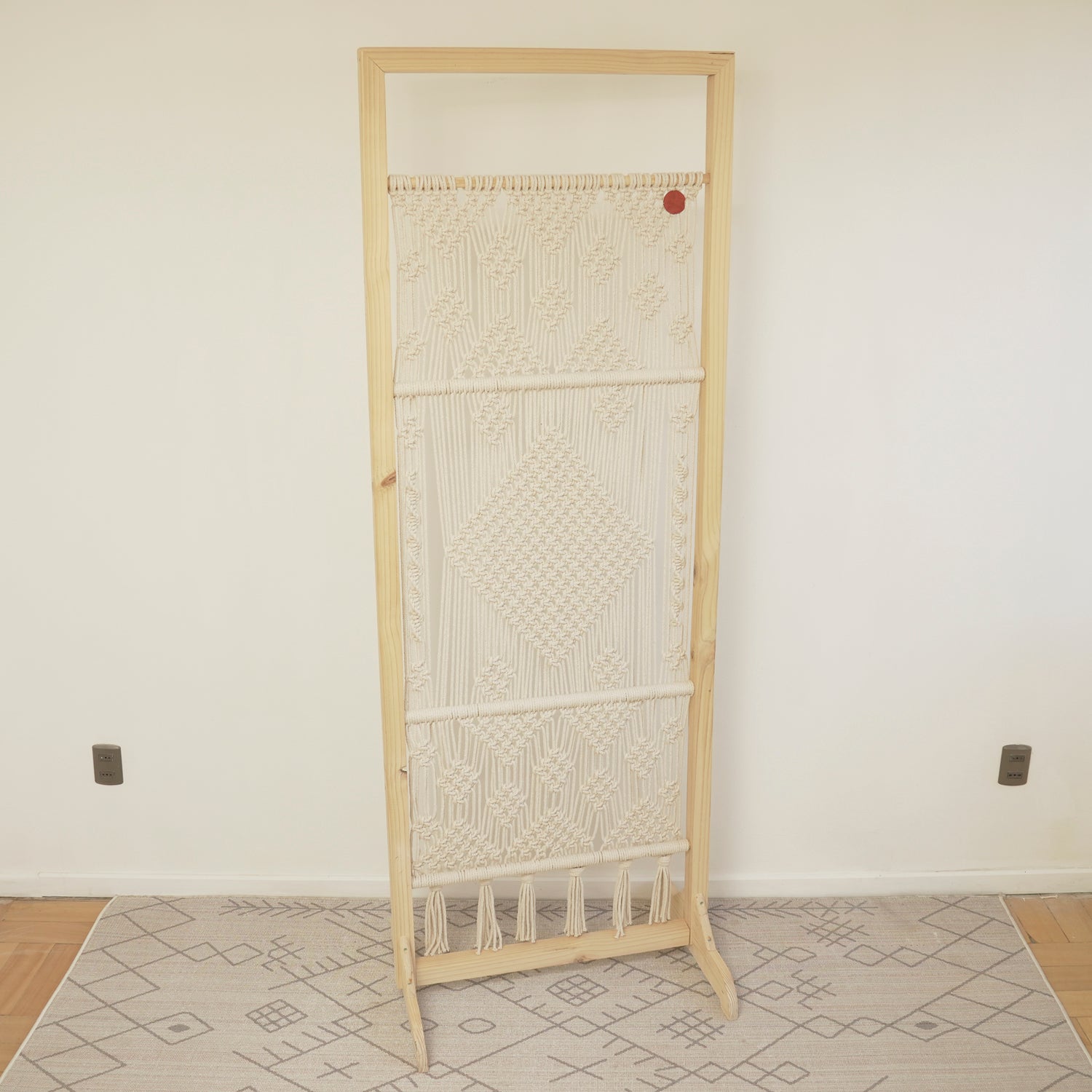 Define tus espacios con arte y calidez gracias al Biombo de Macramé, una pieza tejida completamente a mano que combina estructura de madera natural con hilo de algodón puro.