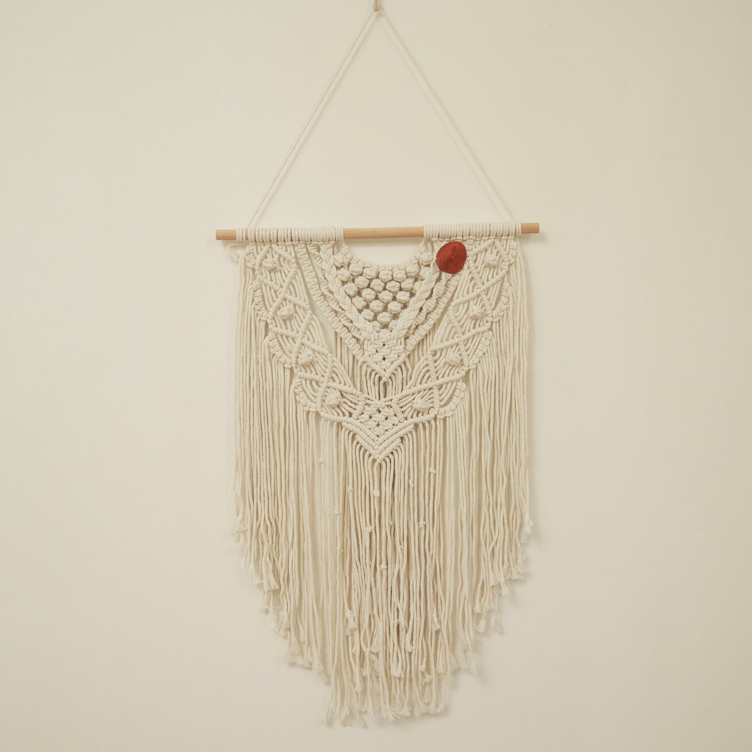 Su diseño en macramé, con nudos delicados y flecos en caída, crea un efecto visual armónico que aporta calidez y un toque bohemio único a cualquier espacio.